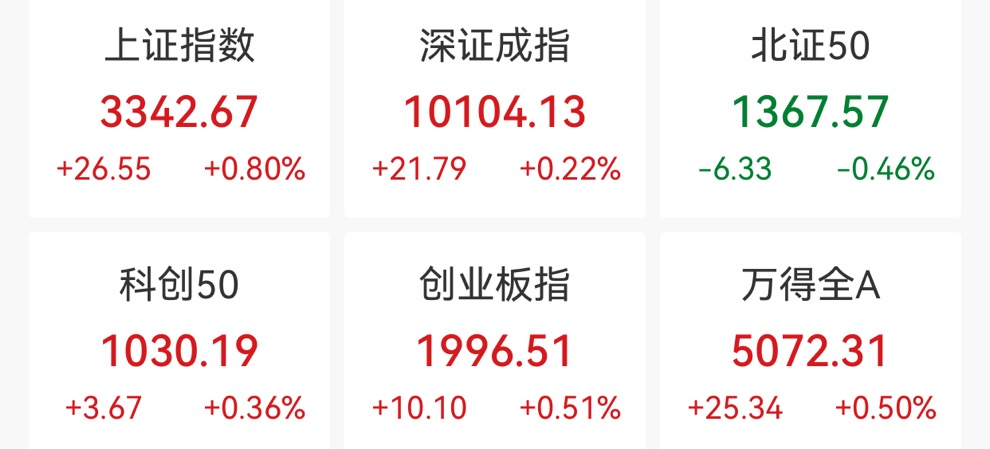 中新经纬5月7日电 7日,A股下探回升,三大指数集体飘红。截至收盘,上证指数涨0.80%,报3342.67点;深证成指涨0.22%策略吧,报10104.13点;创业板指涨0.51%,报1996.51点。